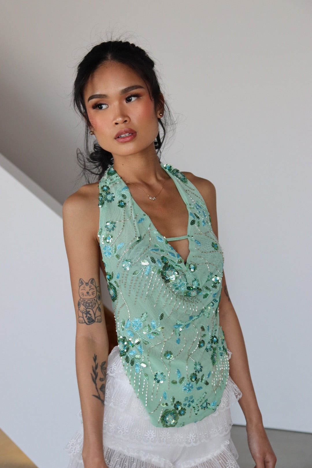 Bold yet ethereal, the Athena Halter Top drapes the body in sheer, effortless glamour. Crafted in a soft sage green mesh and adorned with intricate beadwork and hand sequin embroidery, it features a plunging cowl neckline and a delicate tie-up halter that leaves the back beautifully bare. The semi-sheer finish adds a whisper of allure, while its lightweight feel makes it ideal for warm-weather escapes.