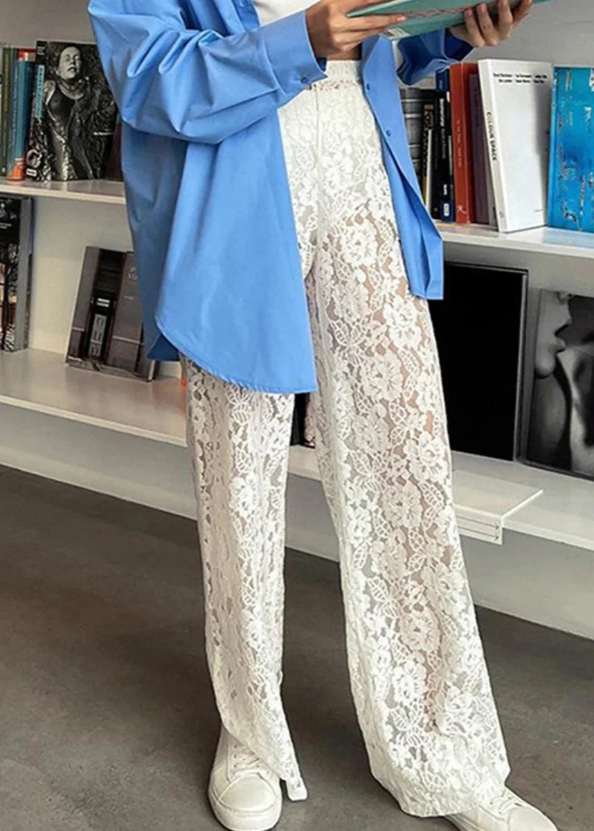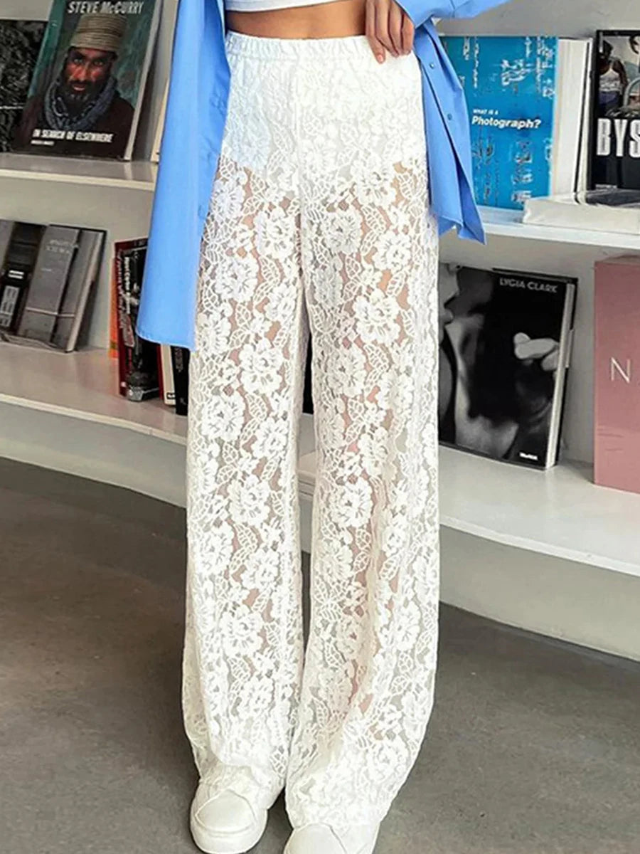 Step into effortless elegance with the Bella Pants – a statement piece that’s equal parts chic and daring. Crafted from delicate white floral lace, these wide-leg pants are designed with a high-rise fit and built-in lining for coverage where you need it, while leaving the legs beautifully sheer. Breezy, lightweight, and eye-catching, they’re perfect for layering over swimwear on vacation or styling with a sleek top for a night out.