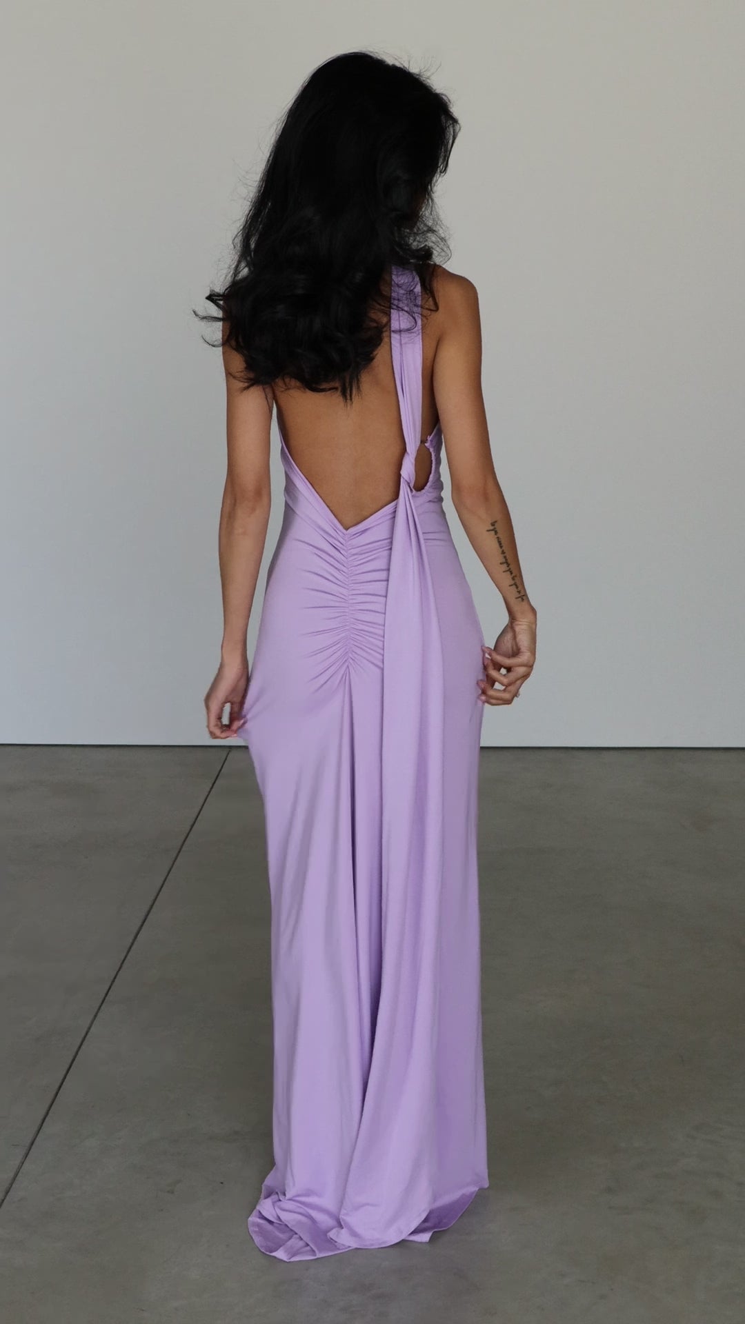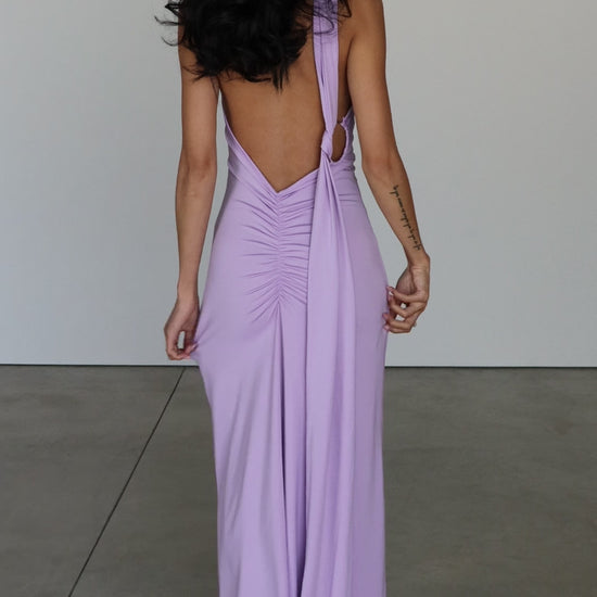 The Elysian Maxi Dress in Lilac is the definition of modern elegance with an ethereal edge — making it the perfect wedding guest dress. Designed in a dreamy soft lilac hue, this gown features an asymmetric halter neckline that flows into a dramatic open back, accented by a striking metal O-ring detail for a contemporary twist.