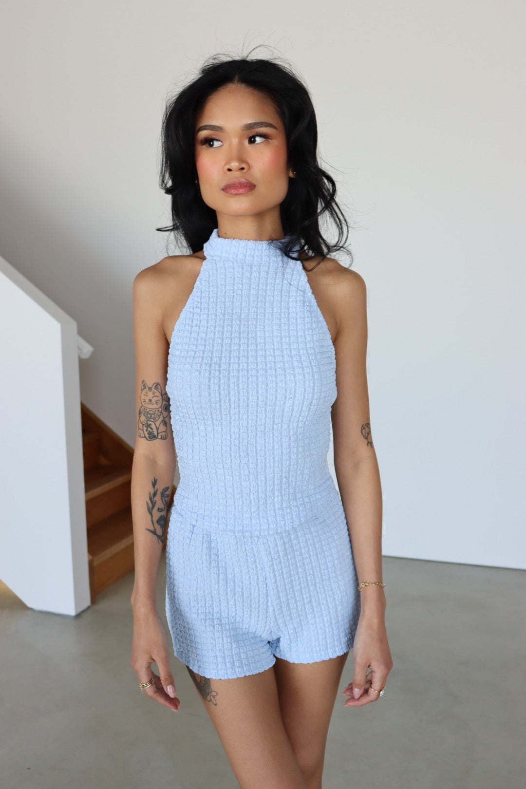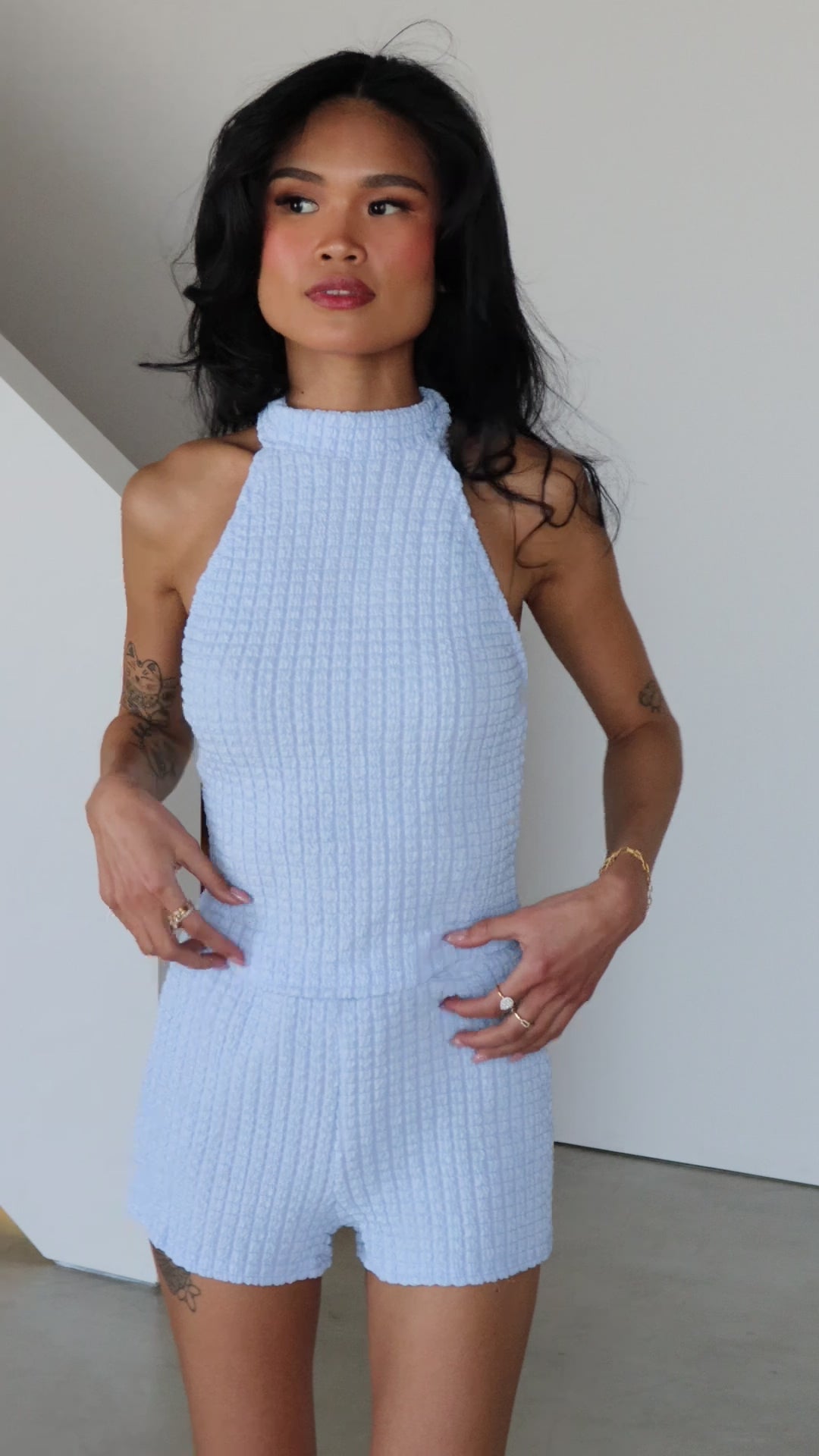 The Rae Halter Set is made for sunny days and warm nights. Crafted in soft waffle fabric, it’s lightweight, breathable, and oh-so comfy against the skin. The halter top ties at the neck for a flattering fit, while the matching shorts keep things easy and effortless. Whether you’re heading to brunch, beach hopping, or just soaking up the warmer weather, this set is your new throw-on-and-go outfit. Cute, casual, and a little bit cheeky — the Rae Halter Set is here to be your summer staple.