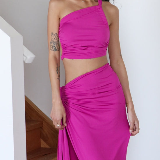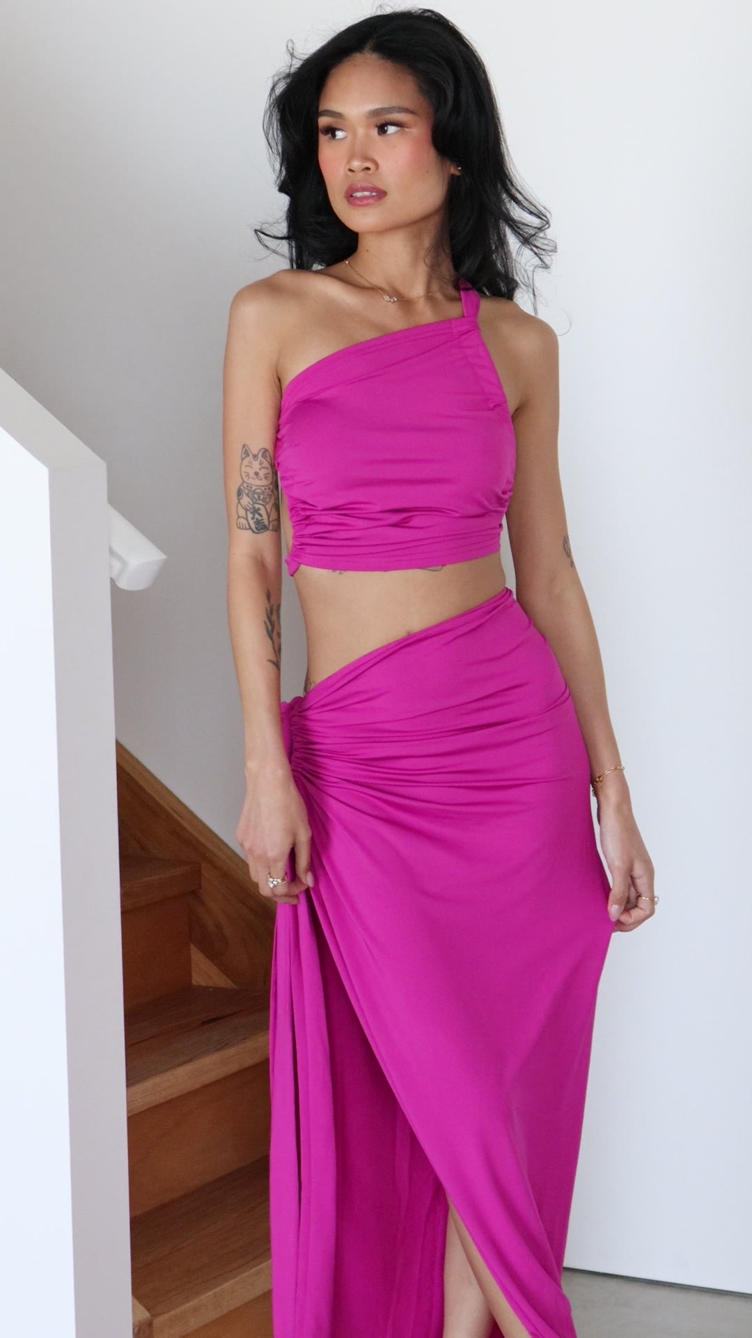 The Rhea Set is made for statement moments with a touch of goddess energy. Featuring a one-shoulder crop top and a matching high-slit skirt with an eye-catching ring detail, this set blends bold design with effortless elegance.