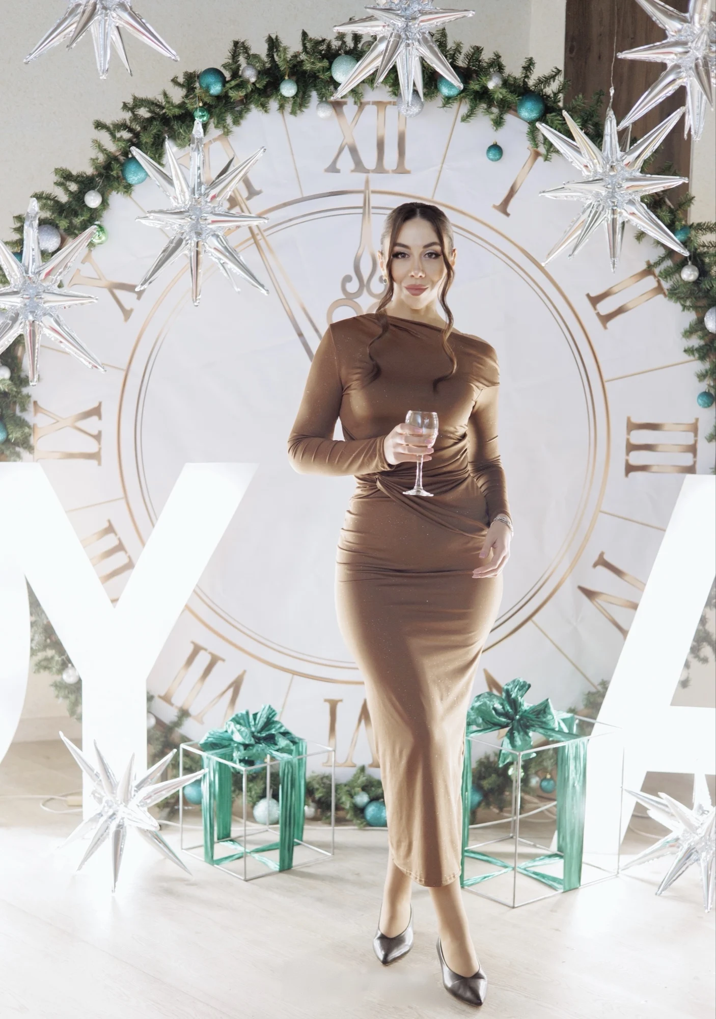 The artful draping at the hip enhances the waistline and adds movement, while the lustrous finish catches the light beautifully. Available in trending lilac (lilace), classic black, and rich brown, the Tierra Lustre Dress delivers versatility with a touch of modern glamour. The lilac dress brings a fresh, fashion-forward glow, while black offers timeless sophistication and brown radiates earthy elegance.