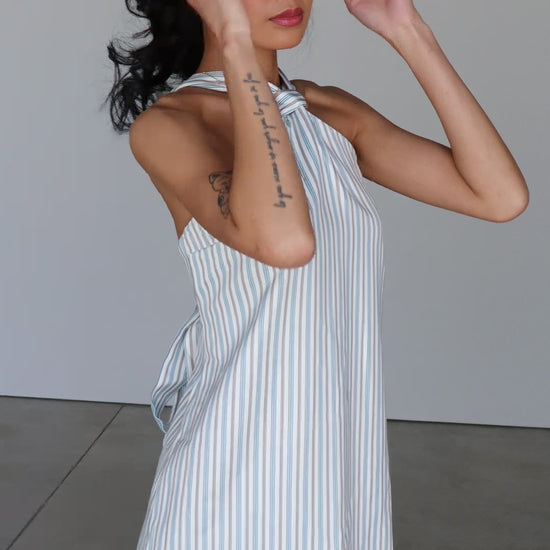 The Lulu Halter Mini is fun, flirty, and perfect for warm-weather dressing. Designed with a halter neckline that ties at the back, it features a playful front twist detail and an open cross-back with a bow tie finish, adding just the right amount of charm. Its A-line silhouette keeps it comfortable while flattering the figure.