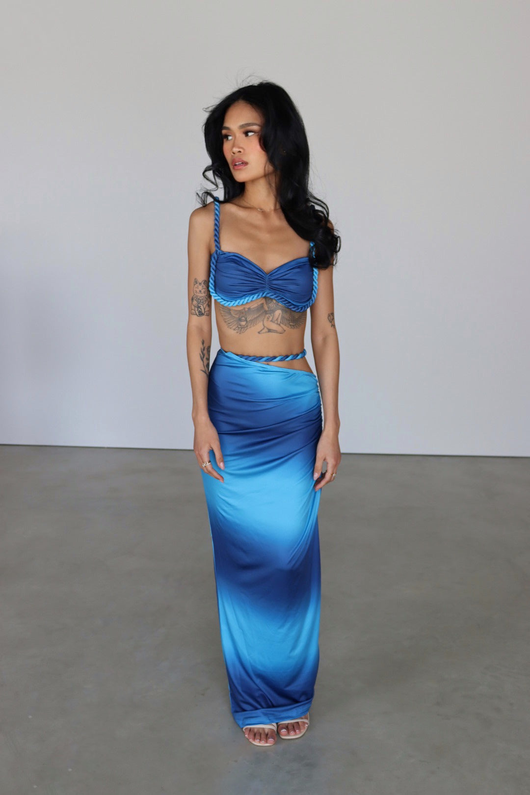 The striking blue gradient evokes the beauty of ocean tides, while the sleek silhouette ensures a confident, statement-making look. Perfect for summer parties, resort escapes, or evening events, the Zhakita Set is the ultimate blend of modern allure and sophistication.